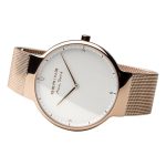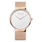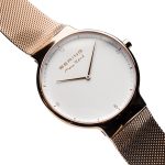 Presenting to you Bering’s Max Rene watch inspired by the hues of the glaciers and meant to stand out forever. This is a salient new piece added to our collection, with a scratch resistant sapphire crystal surface and Milanese band. The pure white dial against the rose gold canvas along with its minimal time stamps provide a look that stuns the viewer.